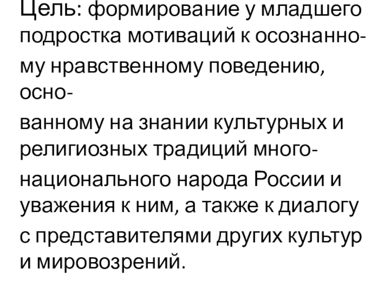Цель: формирование у младшего подростка мотиваций к осознанно-му нравственному поведению, осно-ванному на знании культурных и религиозных традиций много-национального народа России и уважения к ним, а также к диалогус представителями других культур и мировозрений.