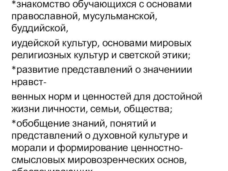 *обобщение знаний, понятий и представлений о духовной культуре и морали и формирование ценностно-смысловых мировозренческих основ, обеспечивающих