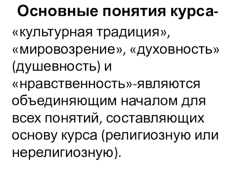 Основные понятия курса-«культурная традиция», «мировозрение», «духовность»(душевность) и «нравственность»-являются объединяющим началом для всех понятий, составляющих основу курса (религиозную