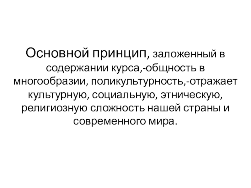 Основной принцип, заложенный в содержании курса,-общность в многообразии, поликультурность,-отражает культурную, социальную, этническую, религиозную сложность нашей страны и