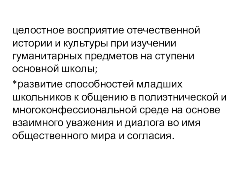 целостное восприятие отечественной истории и культуры при изучении гуманитарных предметов на ступени основной школы;*развитие способностей младших школьников