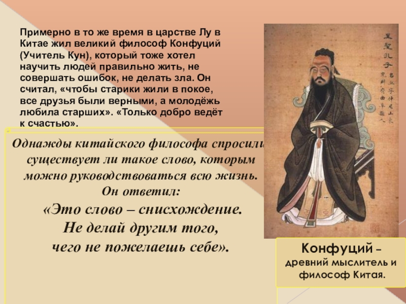 Примерно в то же время в царстве Лу в Китае жил великий философ Конфуций (Учитель Кун), который тоже хотел научить людей правильно жить, не совершать ошибок, не делать зла. Он считал, «чтобы старики жили в покое, все друзья были верными, а молодёжь любила старших». «Только добро ведёт к счастью».