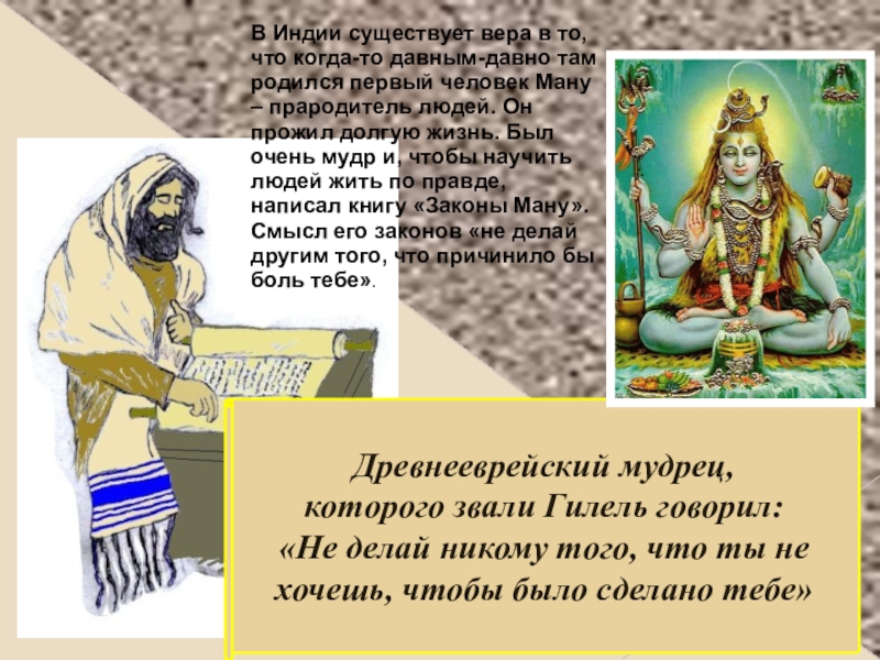 В Индии существует вера в то, что когда-то давным-давно там родился первый человек Ману – прародитель людей. Он прожил долгую жизнь. Был очень мудр и, чтобы научить людей жить по правде, написал книгу «Законы Ману». Смысл его законов «не делай другим того, что причинило бы боль тебе».