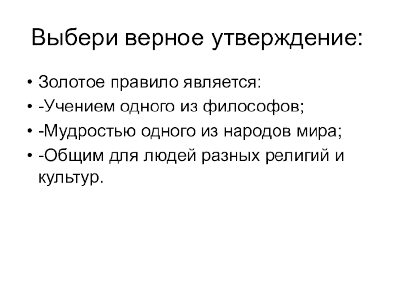 Выбери верное утверждение:Золотое правило является:-Учением одного из философов;-Мудростью одного из народов мира;-Общим для людей разных религий и