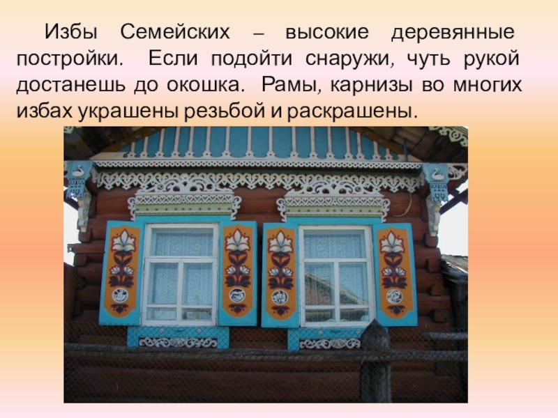Слайд 13 Избы Семейских – высокие деревянные постройки. Если подойти снаружи, чуть рукой