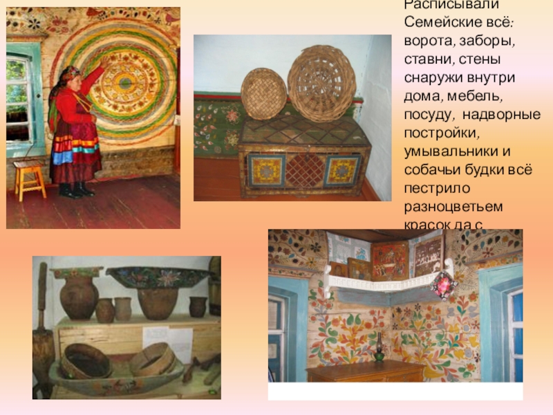 Слайд 16Расписывали Семейские всё: ворота, заборы, ставни, стены снаружи внутри дома, мебель,