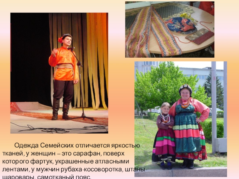 Слайд 18 Одежда Семейских отличается яркостью тканей, у женщин – это сарафан, поверх