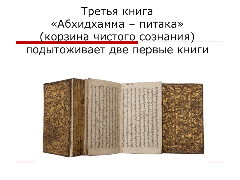 Слайд 7Третья книга «Абхидхамма – питака» (корзина чистого сознания) подытоживает две первые книги