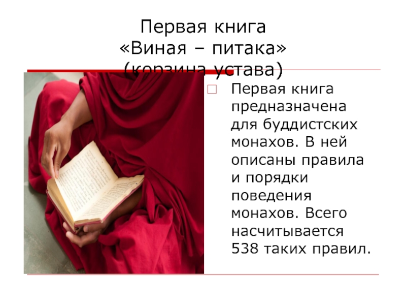 Слайд 5Первая книга «Виная – питака» (корзина устава)
