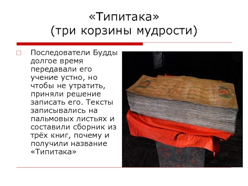 «Типитака» (три корзины мудрости)Последователи Будды долгое время передавали его учение устно, но чтобы не утратить, приняли решение