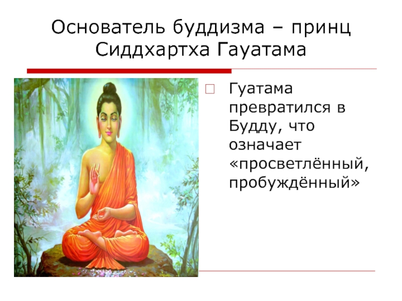 Основатель буддизма – принц Сиддхартха ГауатамаГуатама превратился в Будду, что означает «просветлённый, пробуждённый»