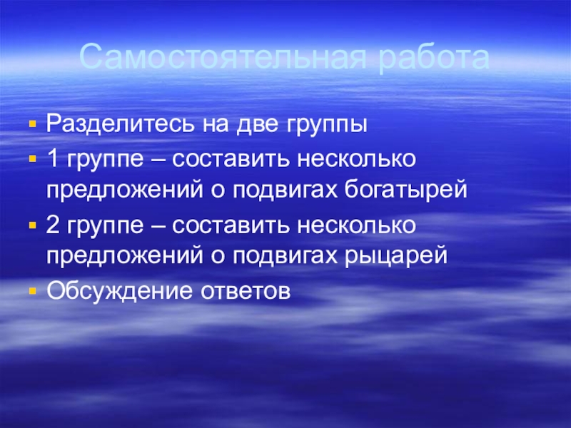 Самостоятельная работаРазделитесь на две группы1 группе – составить несколько предложений о подвигах богатырей2 группе – составить несколько