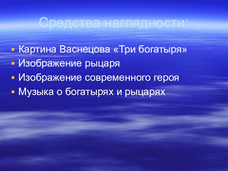 Средства наглядности:Картина Васнецова «Три богатыря»Изображение рыцаряИзображение современного герояМузыка о богатырях и рыцарях