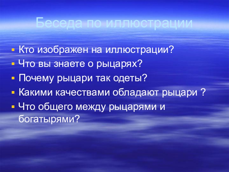 Беседа по иллюстрацииКто изображен на иллюстрации?Что вы знаете о рыцарях?Почему рыцари так одеты?Какими качествами обладают рыцари ?Что
