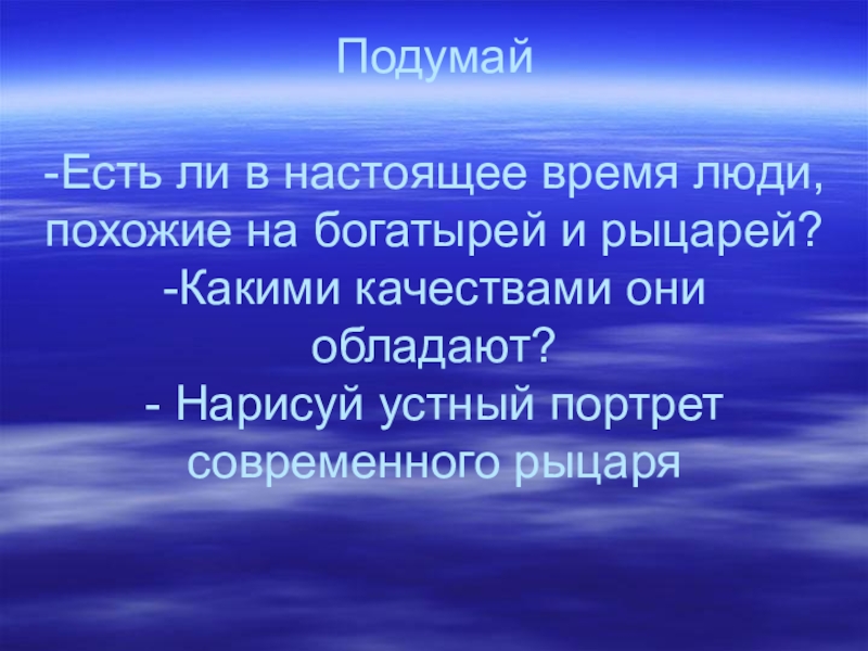 Слайд 14Подумай -Есть ли в настоящее время люди, похожие на богатырей и рыцарей? -Какими