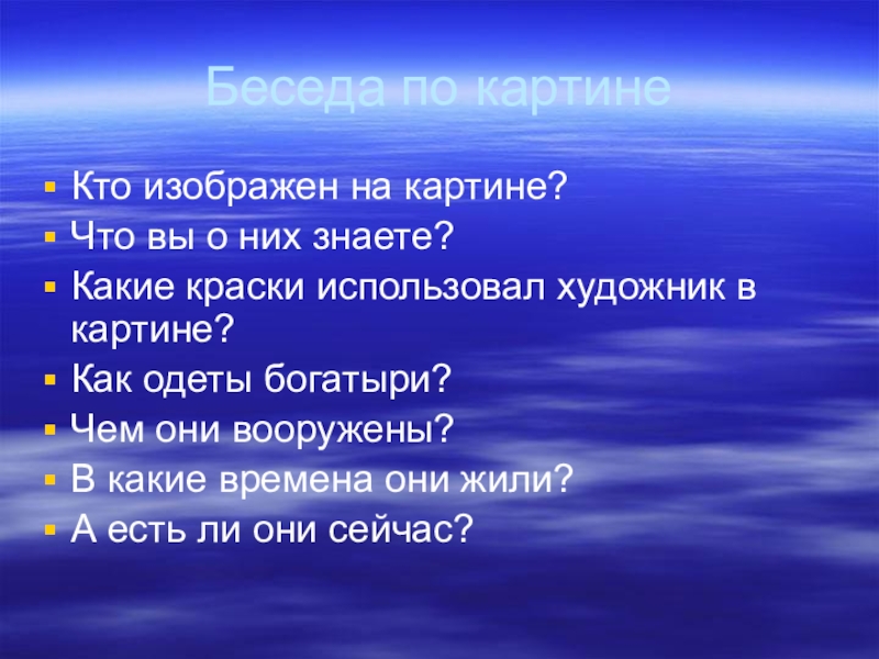 Беседа по картинеКто изображен на картине?Что вы о них знаете?Какие краски использовал художник в картине?Как одеты богатыри?Чем