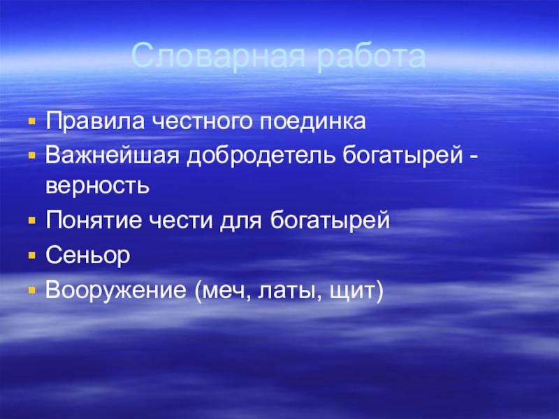 Словарная работаПравила честного поединкаВажнейшая добродетель богатырей - верностьПонятие чести для богатырейСеньорВооружение (меч, латы, щит)