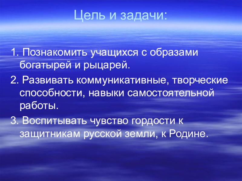 Цель и задачи: 1. Познакомить учащихся с образами богатырей и рыцарей.2. Развивать коммуникативные, творческие способности, навыки самостоятельной
