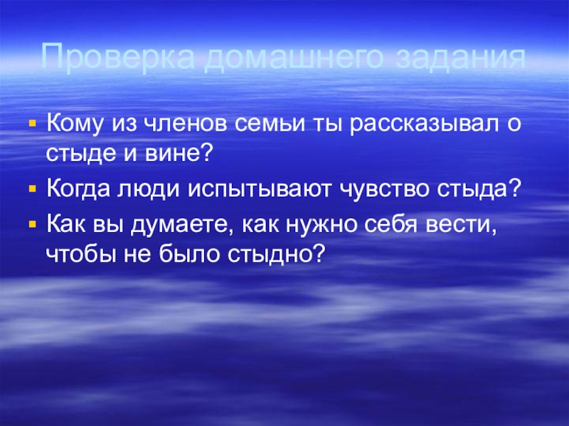 Проверка домашнего заданияКому из членов семьи ты рассказывал о стыде и вине?Когда люди испытывают чувство стыда?Как вы