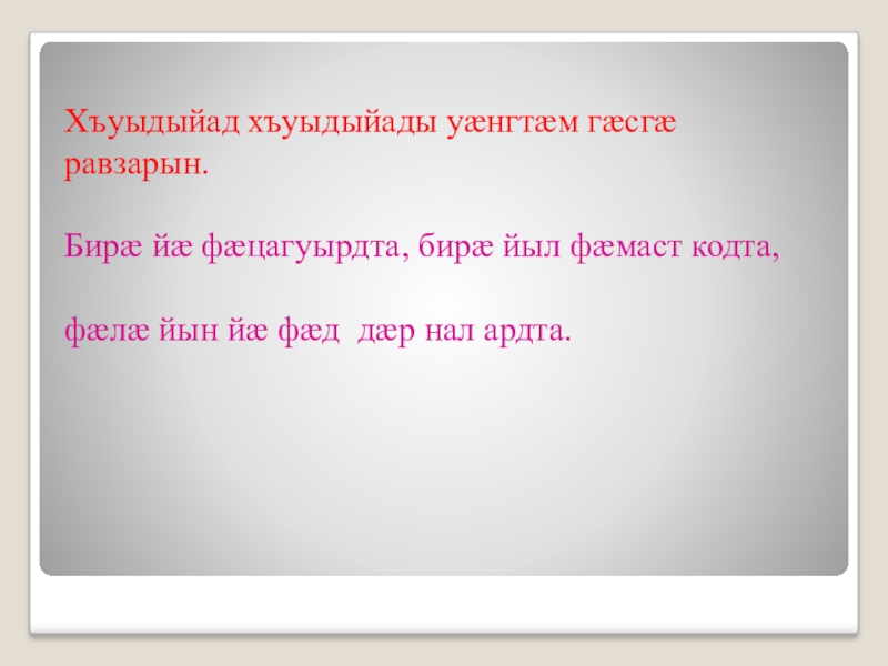 Хъуыдыйад хъуыдыйады уæнгтæм гæсгæ равзарын.Бирæ йæ фæцагуырдта, бирæ йыл фæмаст кодта, фæлæ йын йæ фæд дæр нал