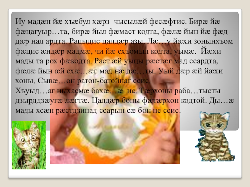 йыл фæмаст кодта, фæлæ йын йæ фæд дæр нал ардта. Рацыдис цалдæр азы. Лæ…у йæхи зонынхъом фæцис æндæр мадмæ, чи йæ схъомыл кодта, уымæ. Йæхи мады та рох фæкодта. Раст æй уыцы рæстæг мад ссардта, фæлæ йын æй схæ…æг мад нæ дæ…ты. Уый дæр æй йæхи хоны. Сывæ…он ратон-батойнаг ссис.