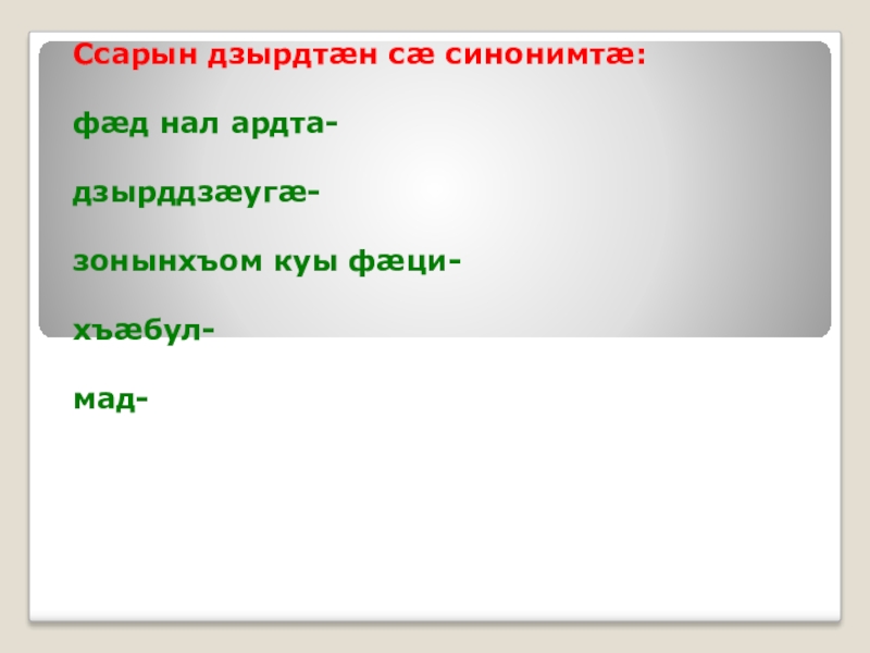 Ссарын дзырдтæн сæ синонимтæ:  фæд нал ардта-  дзырддзæугæ-   зонынхъом куы фæци-  хъæбул-