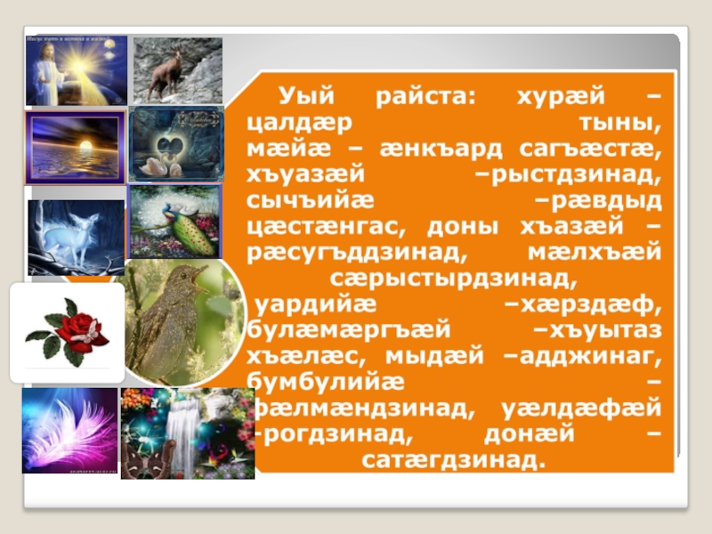 Слайд 16Æнæ хур дидинджытæ нæ ракалынц, æнæ уарзондзинад амонд нæй, æнæ сылгоймаг