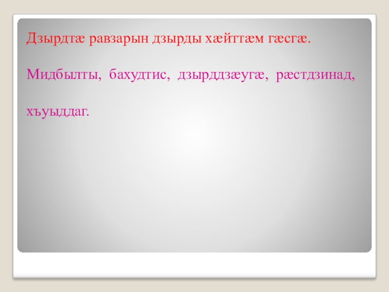 Дзырдтæ равзарын дзырды хæйттæм гæсгæ.Мидбылты, бахудтис, дзырддзæугæ, рæстдзинад, хъуыддаг.