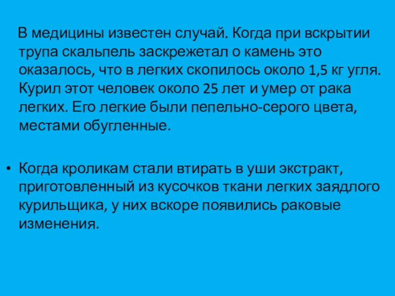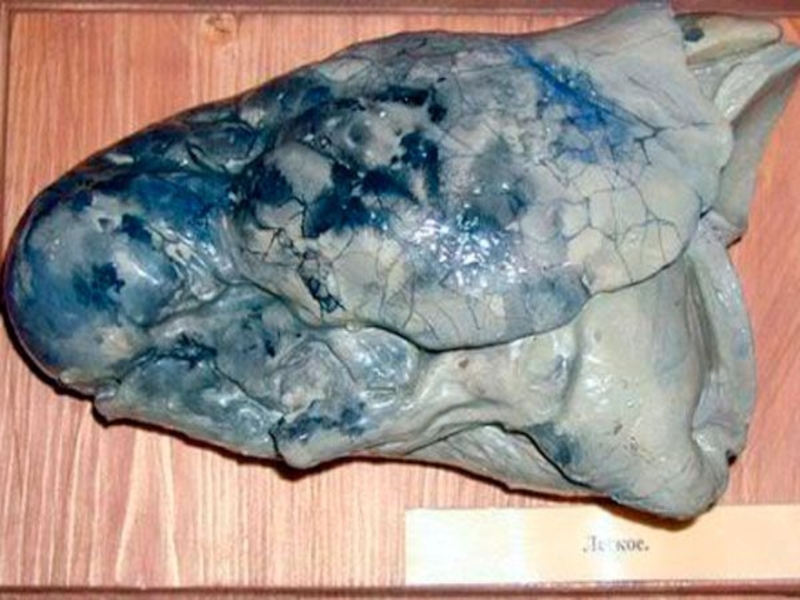 заскрежетал о камень это оказалось, что в легких скопилось около 1,5 кг угля. Курил этот человек около 25 лет и умер от рака легких. Его легкие были пепельно-серого цвета, местами обугленные.