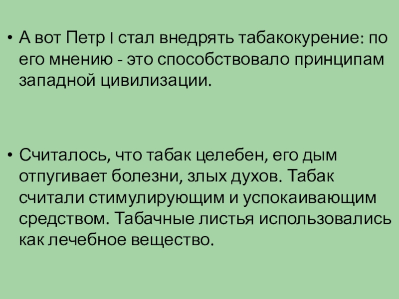 А вот Петр I стал внедрять табакокурение: по его мнению -