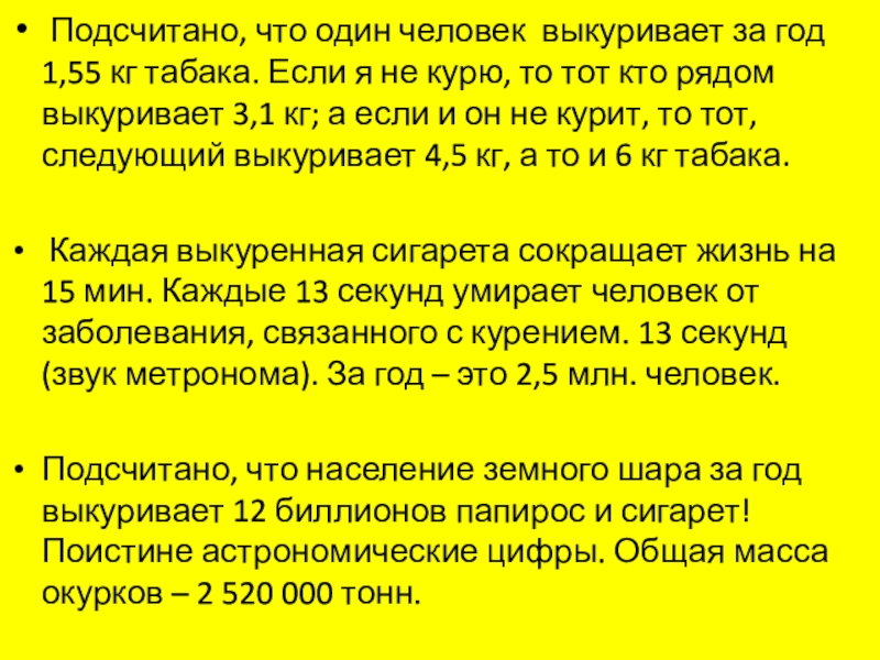 Слайд 22 Подсчитано, что один человек выкуривает за год 1,55 кг табака.