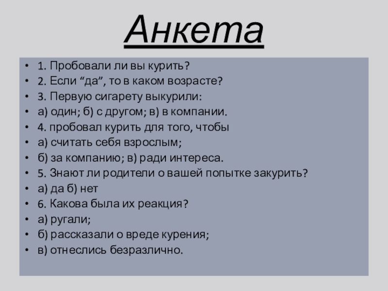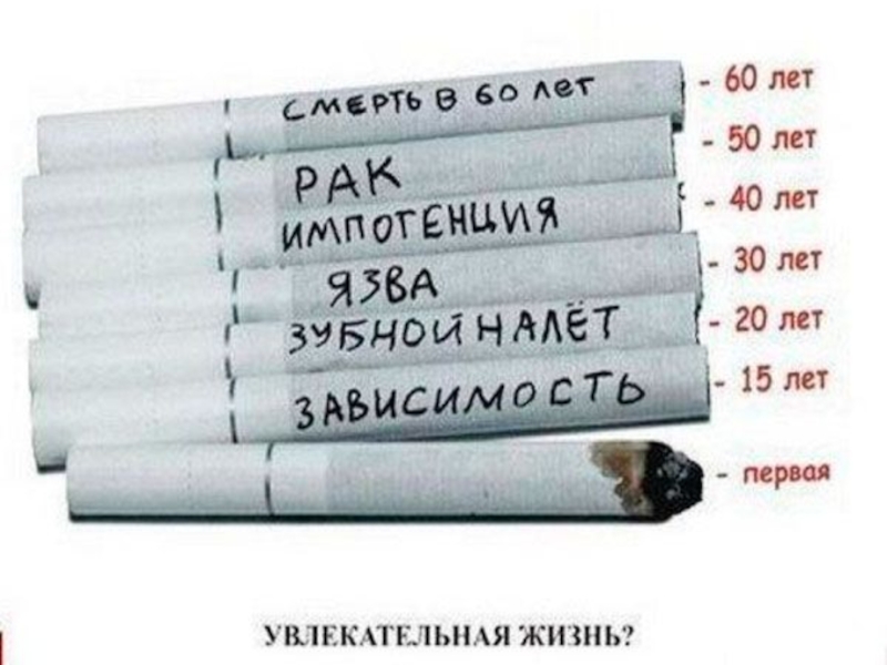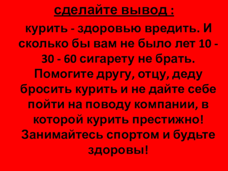 вам не было лет 10 - 30 - 60 сигарету не брать. Помогите другу, отцу, деду бросить курить и не дайте себе пойти на поводу компании, в которой курить престижно! Занимайтесь спортом и будьте здоровы!