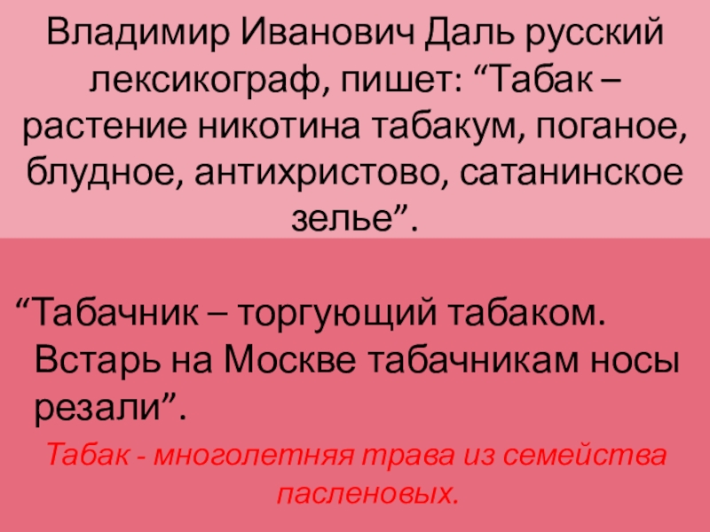 Слайд 4Владимир Иванович Даль русский лексикограф, пишет: “Табак – растение никотина табакум,