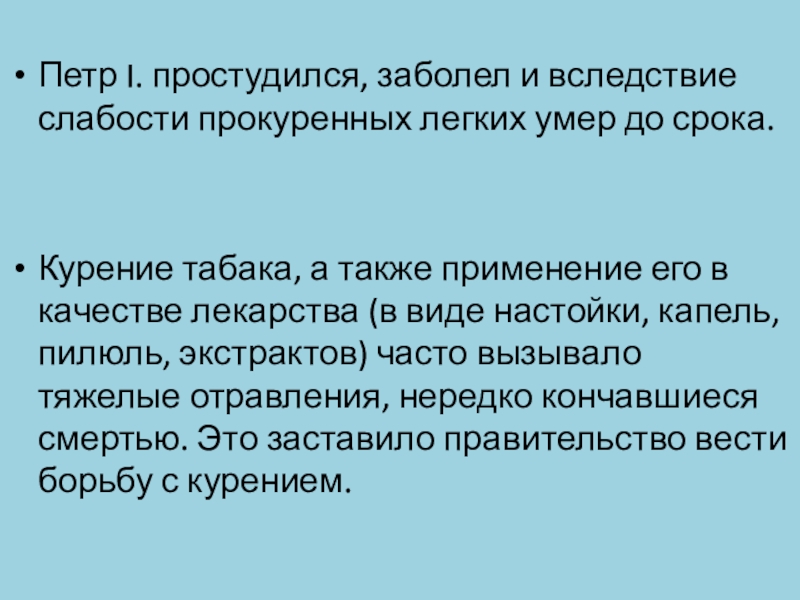 Петр I. простудился, заболел и вследствие слабости прокуренных легких умер до