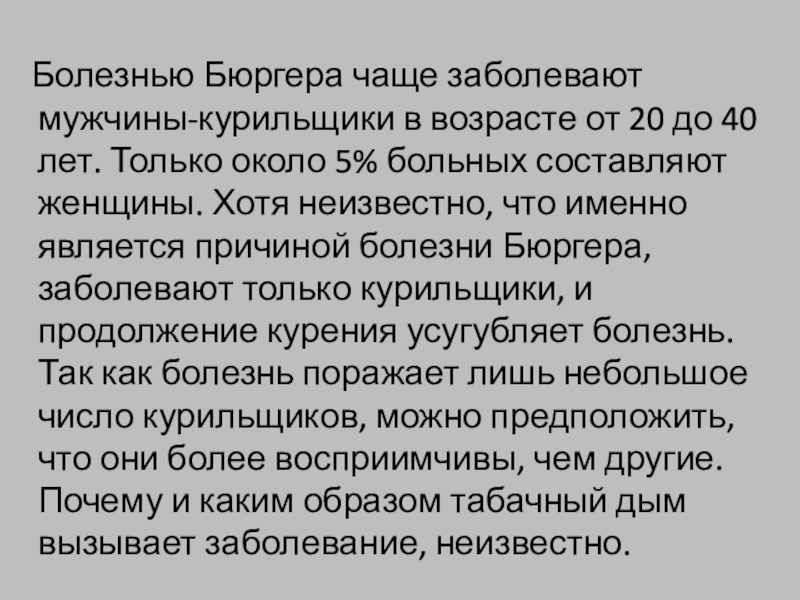 от 20 до 40 лет. Только около 5% больных составляют женщины. Хотя неизвестно, что именно является причиной болезни Бюргера, заболевают только курильщики, и продолжение курения усугубляет болезнь. Так как болезнь поражает лишь небольшое число курильщиков, можно предположить, что они более восприимчивы, чем другие. Почему и каким образом табачный дым вызывает заболевание, неизвестно.
