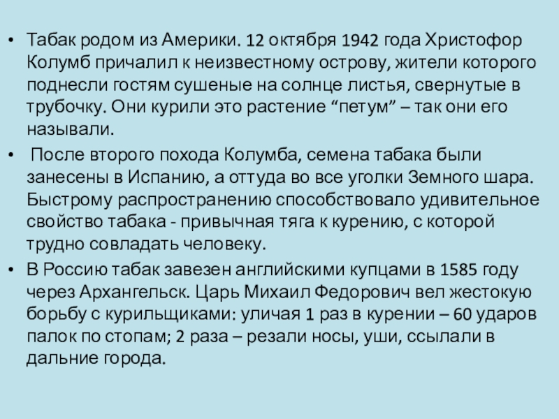В Россию табак завезен английскими купцами в 1585 году через Архангельск. Царь Михаил Федорович вел жестокую борьбу с курильщиками: уличая 1 раз в курении – 60 ударов палок по стопам; 2 раза – резали носы, уши, ссылали в дальние города.