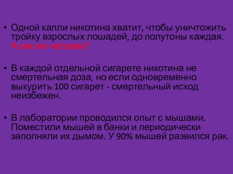 Одной капли никотина хватит, чтобы уничтожить тройку взрослых лошадей, до полутоны