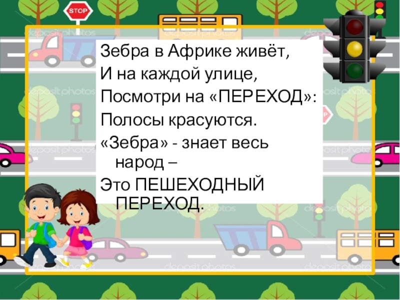 Зебра в Африке живёт,И на каждой улице,Посмотри на «ПЕРЕХОД»:Полосы красуются.«Зебра» - знает весь народ –Это ПЕШЕХОДНЫЙ ПЕРЕХОД.