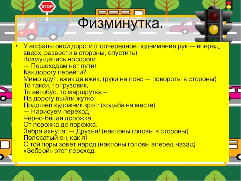 Физминутка.У асфальтовой дороги (поочередное поднимание рук — вперед, вверх, развести в стороны, опустить) Возмущались носороги: — Пешеходам