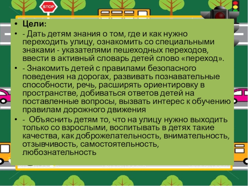 - Знакомить детей с правилами безопасного поведения на дорогах, развивать познавательные способности, речь, расширять ориентировку в пространстве, добиваться ответов детей на поставленные вопросы, вызвать интерес к обучению правилам дорожного движения