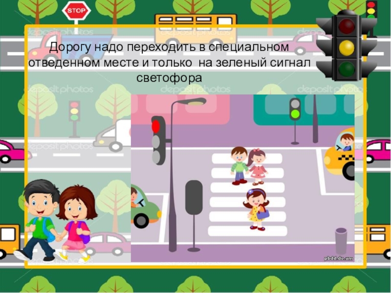 Слайд 9Дорогу надо переходить в специальном отведенном месте и только на зеленый
