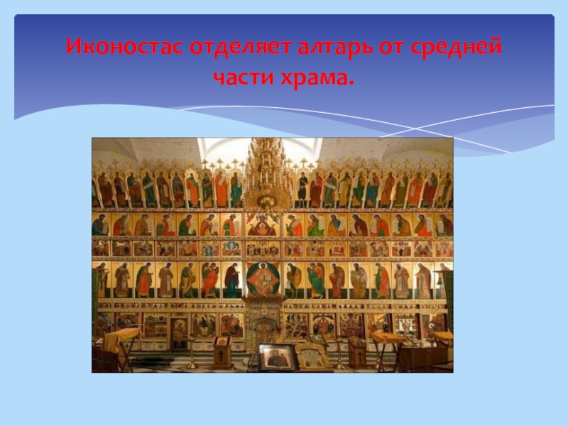Слайд 23Иконостас отделяет алтарь от средней части храма.