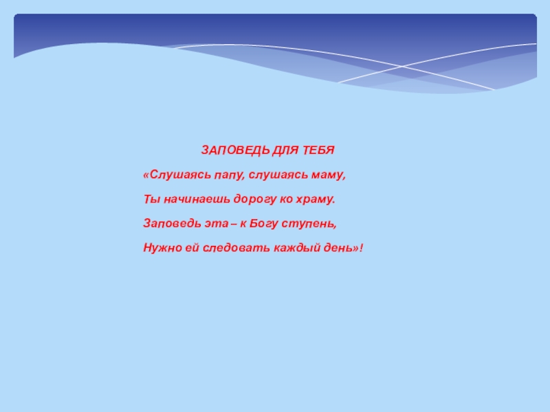 ЗАПОВЕДЬ ДЛЯ ТЕБЯ«Слушаясь папу, слушаясь маму,Ты