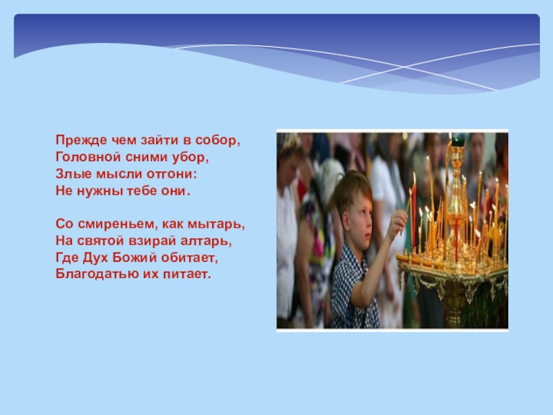 Слайд 15Прежде чем зайти в собор,  Головной сними убор,  Злые мысли отгони:  Не нужны тебе