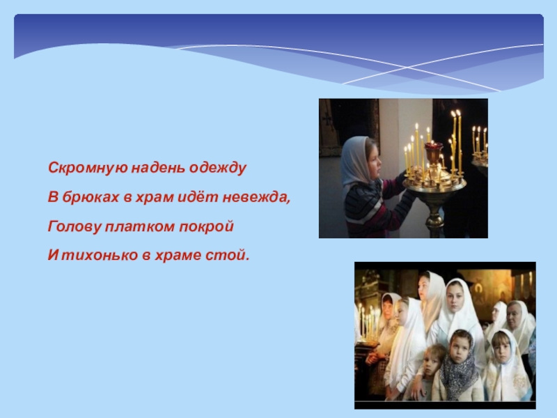 Скромную надень одеждуВ брюках в храм идёт невежда,Голову платком покройИ тихонько в храме стой.