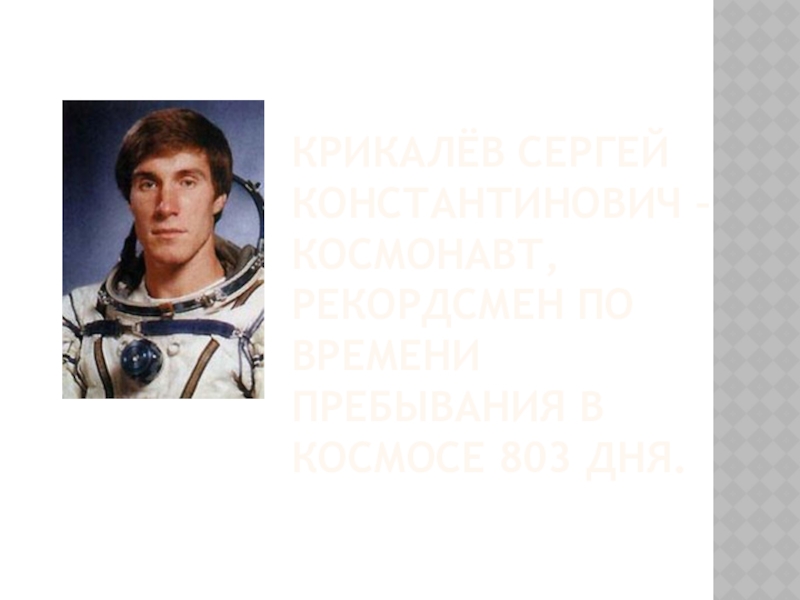 Слайд 5Крикалёв Сергей Константинович – космонавт, рекордсмен по времени пребывания в космосе