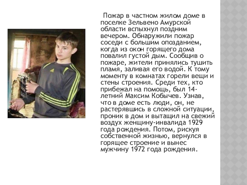 Амурской области вспыхнул поздним вечером. Обнаружили пожар соседи с большим опозданием, когда из окон горящего дома повалил густой дым. Сообщив о пожаре, жители принялись тушить пламя, заливая его водой. К тому моменту в комнатах горели вещи и стены строения. Среди тех, кто прибежал на помощь, был 14-летний Максим Кобычев. Узнав, что в доме есть люди, он, не растерявшись в сложной ситуации, проник в дом и вытащил на свежий воздух женщину-инвалида 1929 года рождения. Потом, рискуя собственной жизнью, вернулся в горящее строение и вынес мужчину 1972 года рождения.