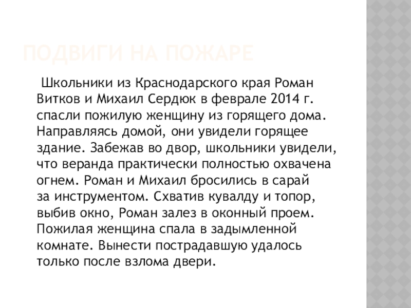 Подвиги на пожаре Школьники из Краснодарского края Роман Витков и Михаил Сердюк в феврале 2014 г. спасли пожилую женщину из горящего дома. Направляясь домой, они увидели горящее здание. Забежав во двор, школьники увидели, что веранда