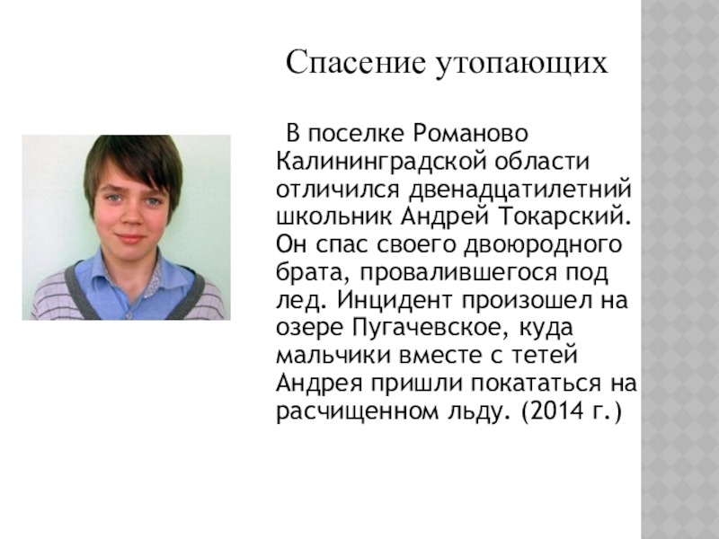 Спасение утопающих   В поселке Романово Калининградской области отличился двенадцатилетний школьник Андрей Токарский. Он