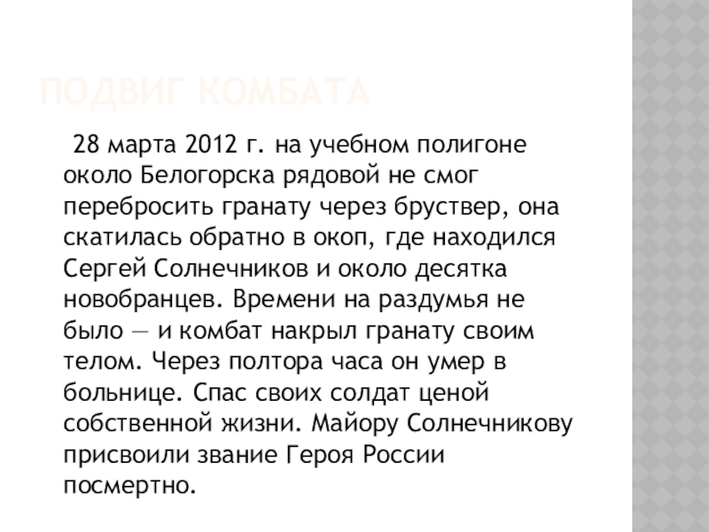 Подвиг комбата  28 марта 2012 г. на учебном полигоне около Белогорска рядовой не смог перебросить гранату